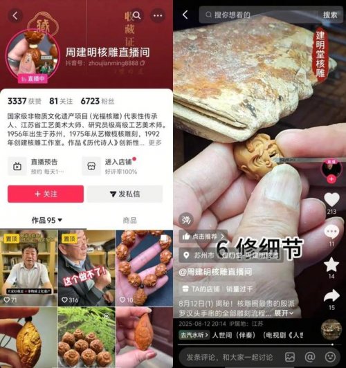 而在抖音电商,其团队以短视频的形式,记录了周建明伏案创作时极致的运刀细节,在直播间,团队深入讲解每件作品背后的历史典故与艺术价值。